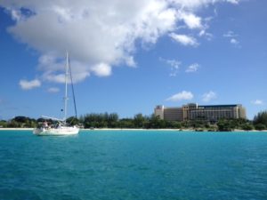 We anchored in the bay of Bridgetown, the capital of Barbados. At the beachfront are two prominent hotel resorts the Radisson and the Hilton. The beachfront is powder white and wide and the water was warm (30 degrees) and clear turquoise. So, the first thing we did was take a dip in the water.